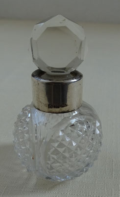 altes Fläschchen aus Glas mit Silbermontur 800 Halbmond Krone und Stöpsel