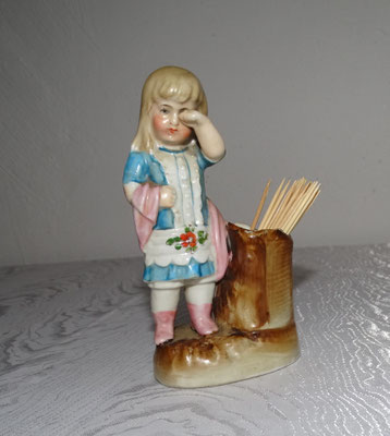 trauriges Kleinkind neben Behältnis (möglicherweise Zahnstocherbehälter oder kleines Väschen)