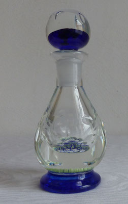 die Flasche selbst ist ebenfalls geschliffen (aus hellem Glas, vermutlich Kristall) und hat einen blauen Standfuß - im Inneren murinnenartig gestaltete Blüten und ebenso mit P gekennzeichnet