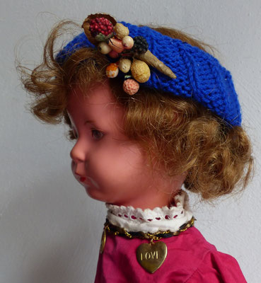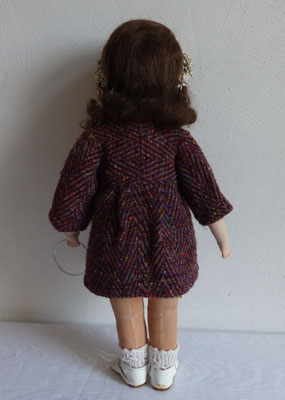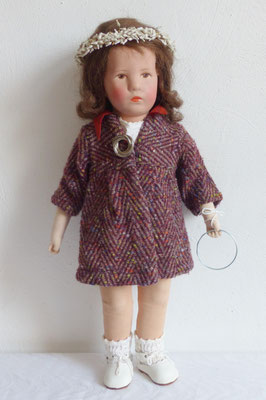 trägt einen alten Wollmantel (wird mit Häkchen geschlossen) - Weißwäscheunterkleidchen (fleckig) - Unterwäsche-Einteiler aus Baumwolle sowie jüngere Echtlederschühchen und angeschmutzte Strickstrümpfe - dazu ein altes offenes Haarkränzchen aus weißen "Beeren", einen Tuch-Clip und einen Armreif