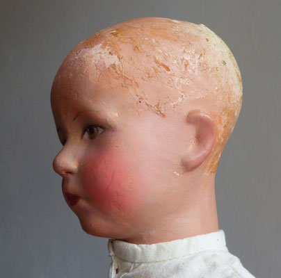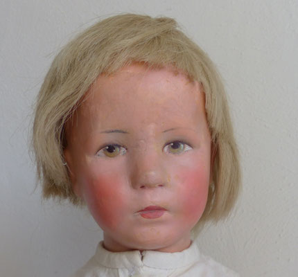 drehbarer Kunststoffkopf mit handgeknüpfter hellblonder Perücke - originale Bemalung (leicht berieben und retuschiert auf Nasenspitze und der linken Wange)