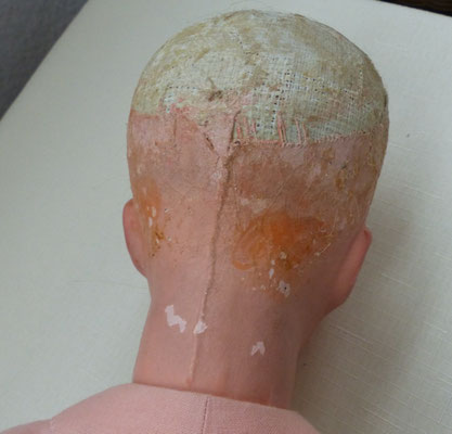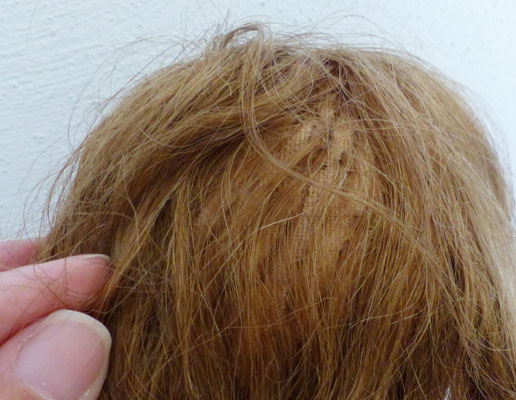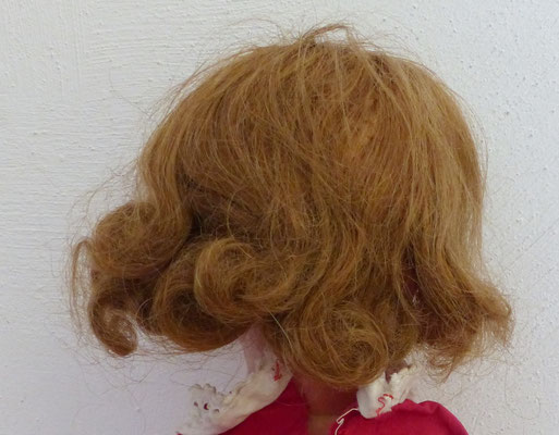 drehbarer Kunststoffkopf mit originaler Bemalung (diese ist noch relativ gut erhalten) - die originale handgeknüpfte Echthaarperücke wurde aber stark beschnippelt (siehe Fotos)