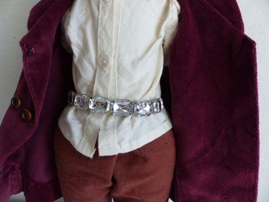 Kleidung ergänzt - Kleidchen zu groß und ohne Verschlüsse - Gürtel mit Zierclip, Stirnband mit Anstecker und lange Strümpfe soweit o.k. - dazu ein Armband als Kette und eine Parfum-Probe