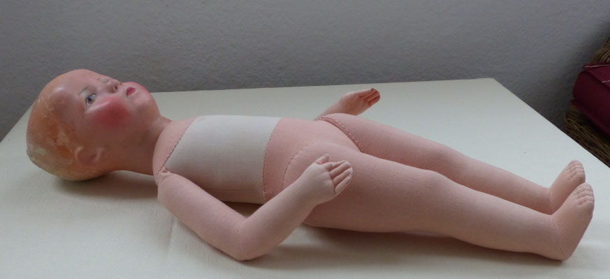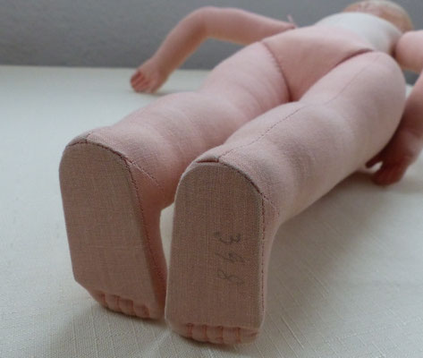 originaler formgeschäumter Trikotkörper mit Stempeln unter den Fußsohlen: Käthe Kruse 1993 - bis auf ein kleines Loch auf der Rückseite eines Beins ist der Körper noch relativ gut erhalten (aber mit einem Alter von 32 Jahren keine Neuware mehr)