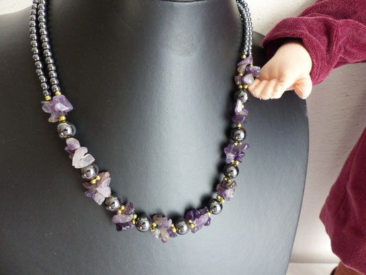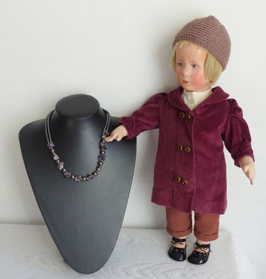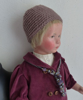 Kleidung ergänzt - meist Vintag - Leinenhose - Leinenhemd - Samtmäntelchen mit Häkchen schließbar - gehäkelte Mütze - Kunststoffschuhe - Armband mit Gummizug als Gürtel und eine Kette aus Hämatit und Edelsteinen (Amethyst etc.)