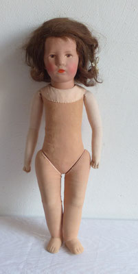 von Hand gestopfter Nesselkörper - habe in einem alten Katalog von 1967 diese Puppe mit dieser Bekleidung gesehen und es ist ein Mimerle - Körper etwas fleckig und eine Fersennaht teils offen - keine Stempel vorhanden
