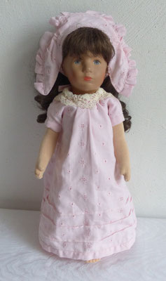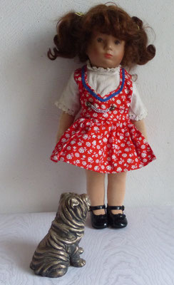 ca. 36 cm lang - Kleidung ergänzt: gut erhaltenes langes Kleidchen mit passendem Kragen, den ich hier als Gürtel eingesetzt habe (könnte man auch als