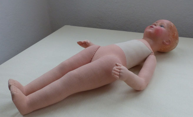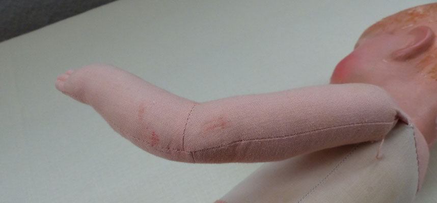 die Puppe weist eher geringe Alters- und Gebrauchsspuren auf (z.B. an den Beinen)