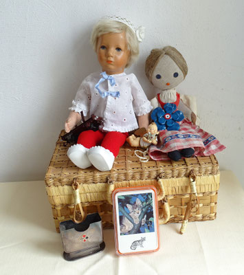 Käthe Kruse Puppe Typ XIII Hampelchen handgestopfter Körper inkl. Habseligkeiten im Koffer