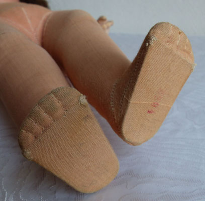 vermutlich in den Kruse-Werkstätten restauriert - der Körper ist bis auf Arme und Halslatz wohl original, hat eher einen bräunlichen Teint (hat die breitere Hüften sowie Kniekehlennähte, die nur bei alten Körpern zu finden sind) - rote unleserliche Zahl unter Fußsohle