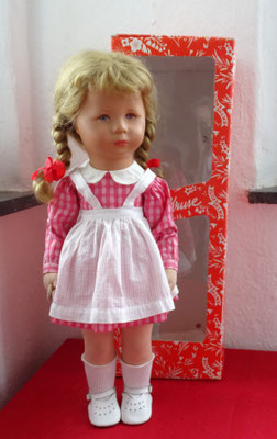 ca. 47 cm lang und wohl im Originalzustand -- den Karton gebe ich dazu, er ist aber jünger als die Puppe