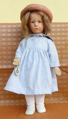 Unterwäsche und Echtlederschühchen original Kruse, aber aus jüngerer Zeit - das gestreifte Kleidchen mit dem nachträglich angenähten alten Matrosenkragen ist ebenfalls aus jüngerer Zeit, ebenso die langen Kniestrümpfe (für die Puppe etwas zu groß) - dazu ein kleiner Keramikteller am Bändchen und ein alter Strohhut