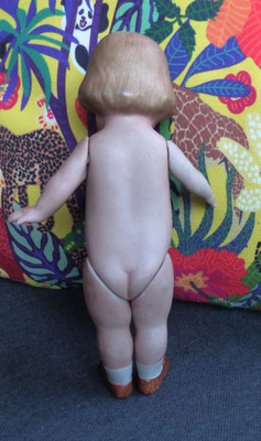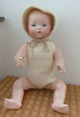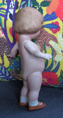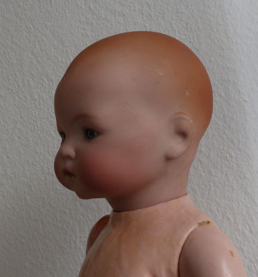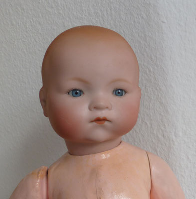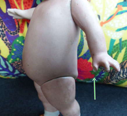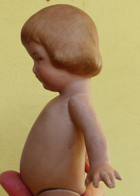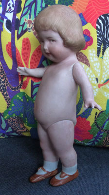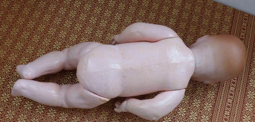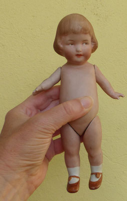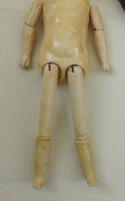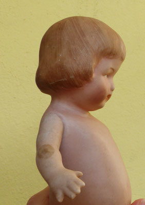 auf einen ungewöhnlich langen, schlanken Gliederkörper montiert, der teils farblich retuschiert wurde - ein Oberschenkelkopf unschön restauriert - dafür sind aber beide Händchen noch relativ ordentlich erhalten (zumindest ohne Brüche oder Klebestellen)