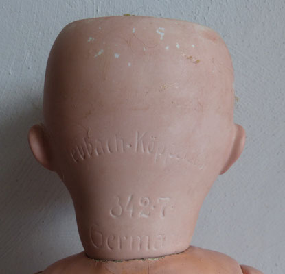 auf einen gut erhaltenen, passenden Gliederkörper montiert - lediglich ein Fingerchen angeklebt - sogar mit Kugeln in den Schultern - undeutliche Prägemarke - Körper von sehr guter Qualität (wohl ein teurer Waltershäuser Gliederkörper, allerdings nicht antik, sondern Vintage)