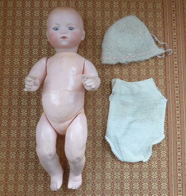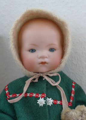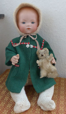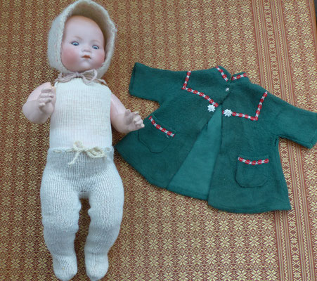 wohl originaler, gut erhaltener Massesitzbabykörper und alt bekleidet (Naht am Mantel etwas offen und mit Altersspuren)