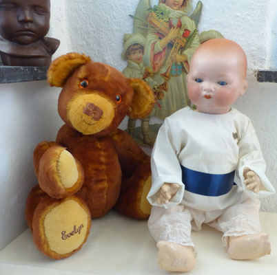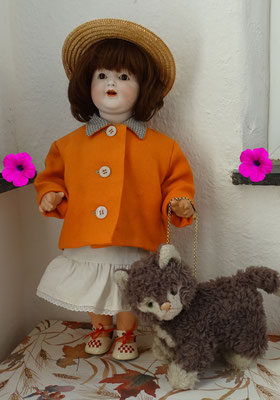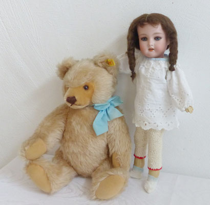 antike Puppe Kopf Biskuit Porzellan ABG 1361 um 1915/25 und Steiff Sulla Katze
