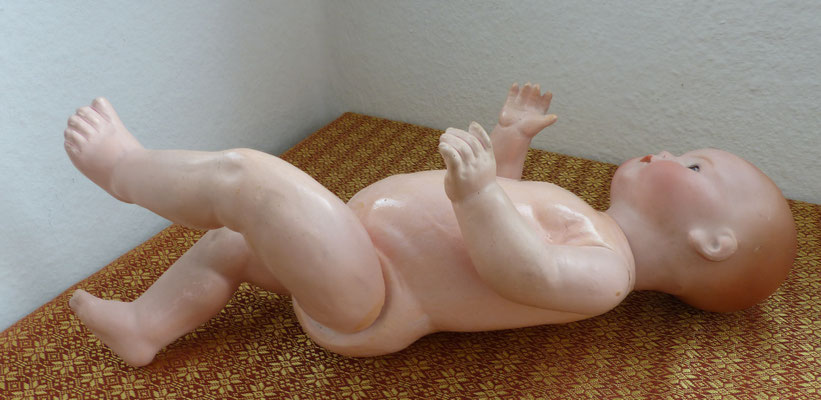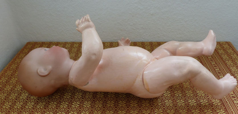 Sitzbabykörper komplett überstrichen sowie mit Altersspuren wie sie auf den Fotos zu erkennen sind
