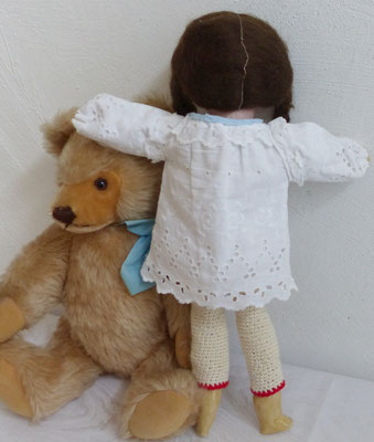 reichlich alt bekleidet (trägt sogar zwei Unterröcke und noch ein Unterkleid) - beim Lösen des Gürtels ist das Fädchen am Häkchenverschluss gerissen (das müsste wieder angenäht werden, sonst kann man den Gürtel nicht mehr benutzen) - das passende Kleidchen wird ebenfalls mit einem Häkchen geöffnet (Häkchen neuer, Kleid farblich etwas ausgeblichen, sonst aber recht gut erhalten)