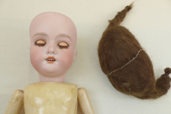 Kurbelkopf Biskuitporzellan - funktionierende braune Schlafaugen aus Glas (Lidfarbe gut erhalten) - offener Mund mit 4 Zähnchen - Kinngrübchen - alte gut erhaltene ergänzte Kunsthaarperücke mit Herstellerplomben an den Enden (Perücke ca. 1950er Jahre)