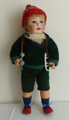 Kleidung: dick gestrickter Pullover und farblich passende Strickhose - ältere Kunststoffschuhe und blaue Strümpfe aus jüngerer Zeit - dazu ein Paar Schlittschuhe an Lederbändchen (Schühchen aus übermaltem Holz o. ä.) und eine alte Pudelmütze (mit Flickspuren) sowie ein Halstuch