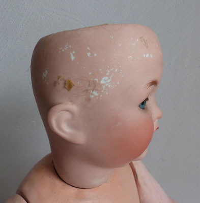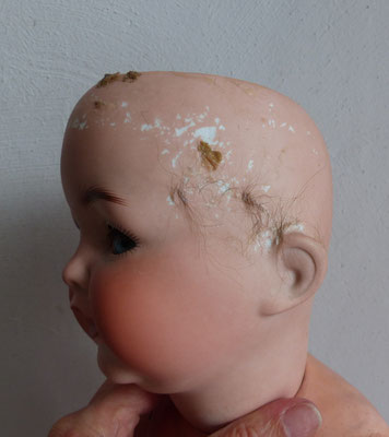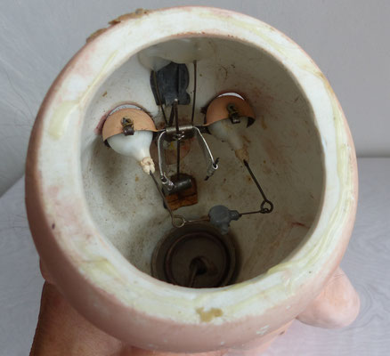 Kurbelkopf aus Biskuitporzellan mit Schlaf-/Schelmenaugen (beide Mechanismen funktionieren) - offener Mund mit nur noch einem Zähnchen, aber dafür mit vibrierender Zunge - alter Kopfdeckel und alte Mohairperücke (mit normalen Altersspuren, muss wieder auf den Kopf geklebt werden, damit man den Perückenpull damit verdecken kann)