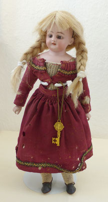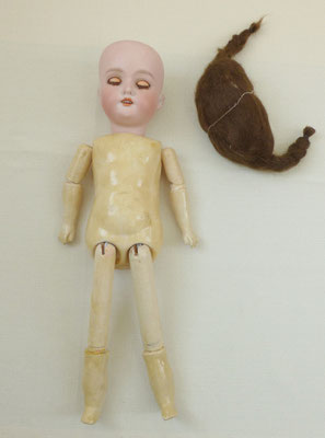Kurbelkopf Biskuitporzellan mit blaugrauen Schlafaugen aus Glas (Mechanismus funktioniert, Lidfarbe fehlt, Augengestell sitzt ein wenig schief) - offener Mund mit Zähnchen - ergänzter Kopfdeckel und Kunsthaarperücke (bitte kämmen)