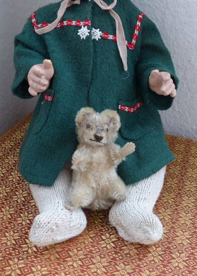 vermutlich komplett original bekleidet - die helle Kleidung ist ziemlich angeschmutzt (werde daher die komplette Kleidung danebenlegen) - Weste noch gut erhalten - Kleidchen samt Schürze mit stärkeren Verschleißstellen - Schühchen halten nur mit Stecknadeln am Fuß (alte Wachstuchschühchen) - dazu ein Armband mit Schlüssel als Zierrat