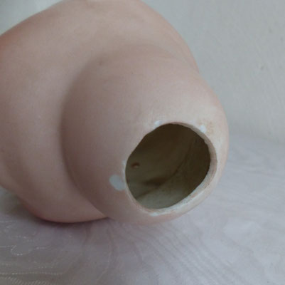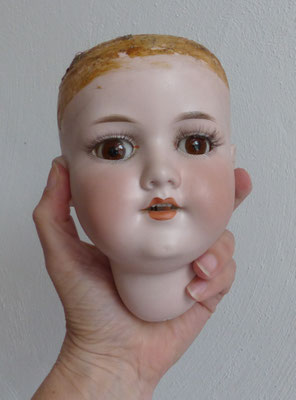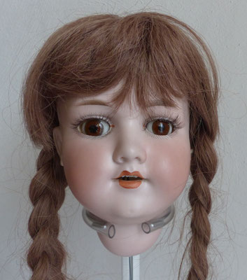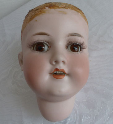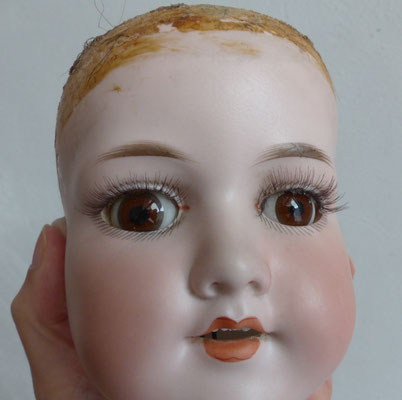 der aufgesetzte Kopf ist ebenfalls ein französischer Kopf und hat den gleichen Farbauftrag wie der Körper - Wangen-, Brauen- und Mundbemalung ebenfalls erneuert, aber nicht so gut