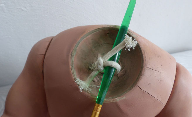 Gummis stramm aufgezogen (ungewöhnlicherweise ist eine Hand mit einem Bein verbunden, und zwar überkreuz) - im Inneren befindet sich zwischen den Armen ein Steg (vermutlich wird hier der