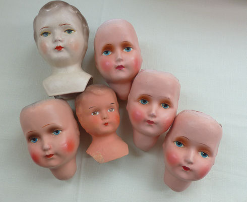 sechs alte Puppen Köpfe aus Lagerbestand unbenutzt aus Pappmaschee gemarkt