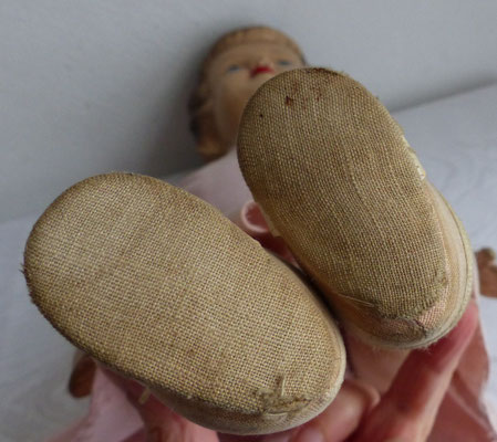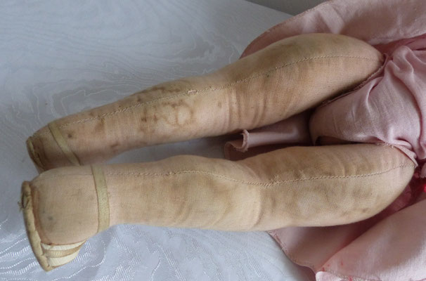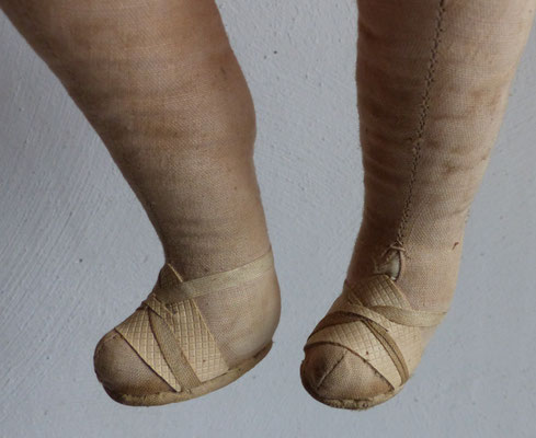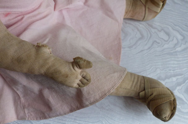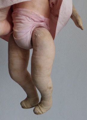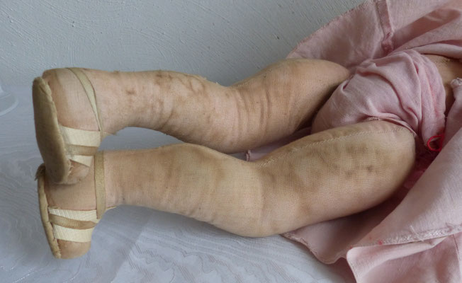 Körper aus fest gestopftem Nessel (altersbedingt teils fleckig und im Fußbereich etwas unschön restauriert)