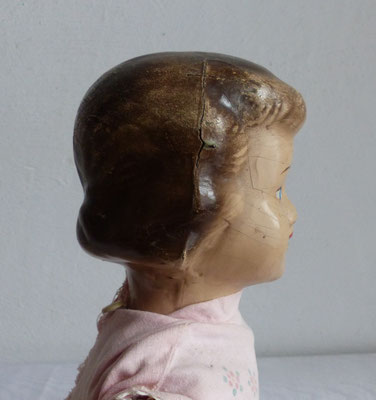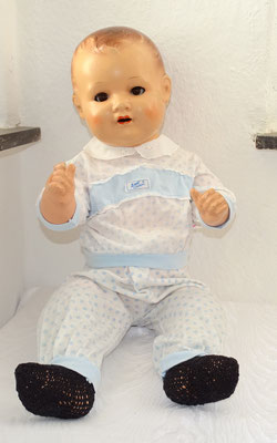 Mamastimme ist noch zaghaft vernehmbar und der Zustand der Puppe ist insgesamt für ihr noch recht gut erhalten (die Herstellung vermute ich etwa Ende der 1950er Jahre) - ca. 50 cm Gesamtlänge