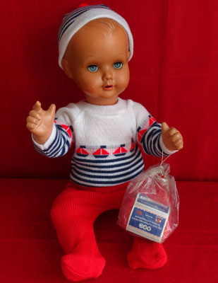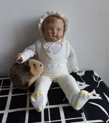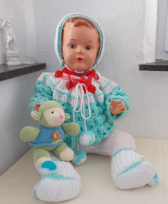mit einem maritimen Strickanzug bekleidet, der ähnlich alt wie die Puppe ist (ca. Ende 1960er bis Anfang 70er Jahre) und er passt doch zum "Hamburger Jung" wie die Faust aufs Auge