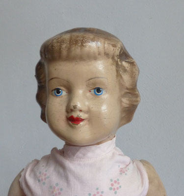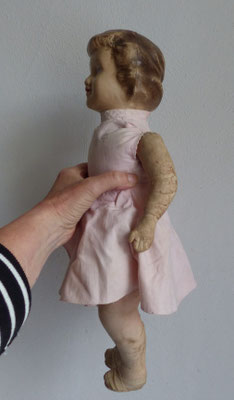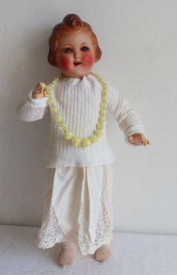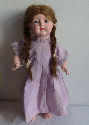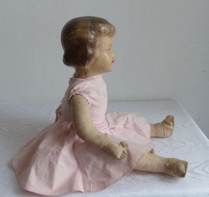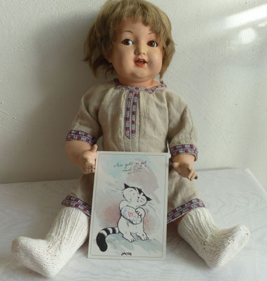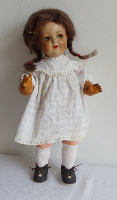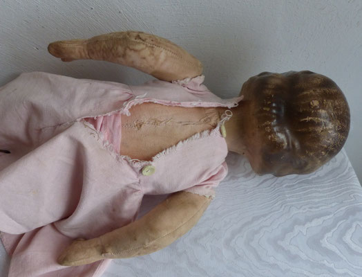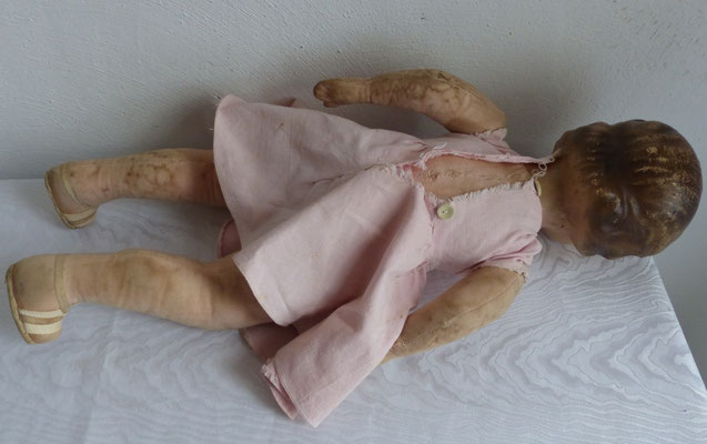 ca. 55 cm lang und etwa in den 1930er/40er Jahren hergestellt, wobei der Kopf ein bißchen klein für den Körper wirkt (?)