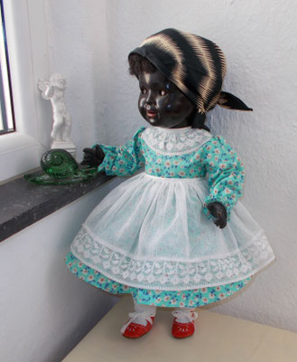 hübsch bekleidete alte Puppe mit dunkler Hautfarbe und Schelmenaugen um 1940/50