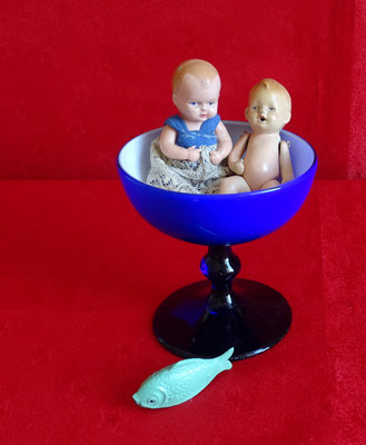 zwei alte Babypüppchen Schildkröt und BV sowie Celluloidfisch und Glaskelch