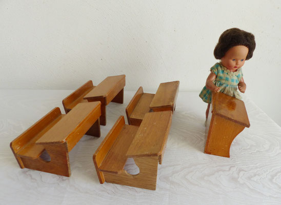 vier alte Schulbänke ein Lehrerpult lackiertes Weichholz ca. 60er Jahre u. Püppchen