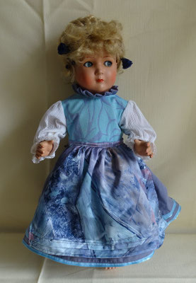 ergänzte Bekleidung aus jüngerer Zeit - recht schöne Handarbeiten, wobei ich vermute, dass das Kleidchen extra für diese Puppe genäht wurde (ca. 80er Jahre) - Haarkranz aus biegsamem Draht mit Stoffblümchen und Perlen - Schuhe und Strümpfe müssten ergänzt werden