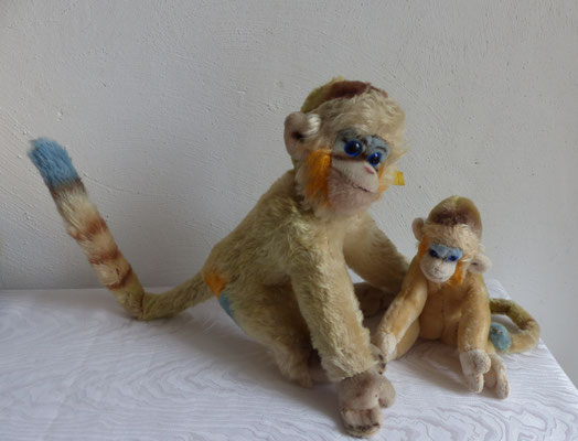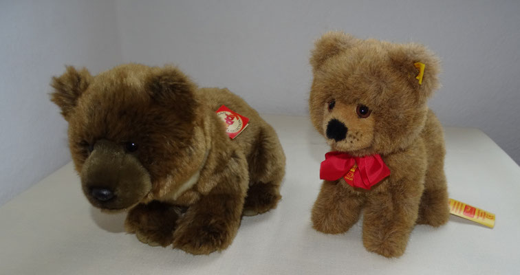 der größere ist die Ausführung in 25 cm mit Knopf und unleserlicher Fahne - eigentlich recht gut erhalten, aber am Schwanz ist die Naht etwas offen und es gibt Verschmutzungen an den Pfoten (die sich vermutlich mit einem feuchten Lappen entfernen lassen)