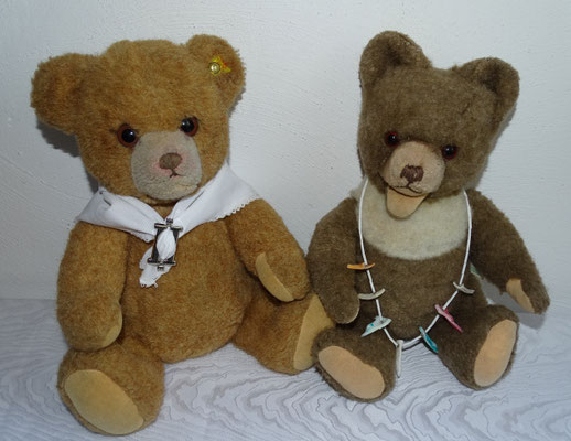 beide mit weichem Material gestopft (aber nicht ganz weich) - beide aus Plüsch mit Alters- und Gebrauchsspuren