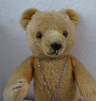 der Clemens-Teddy kann auch den Kopf drehen und hat Glasaugen - trägt eine schicke Kette mit bunten Muschelteilen - 28 cm lang - funktionierende Quietschstimme - ca. 1960er Jahre