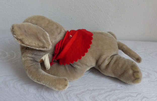 weich gestopfter Steiff Elefant "Floppy Ele" aus Mohair mit gestickten Augen und Stoßzähnen aus Filz - originaler roter Filzkragen noch