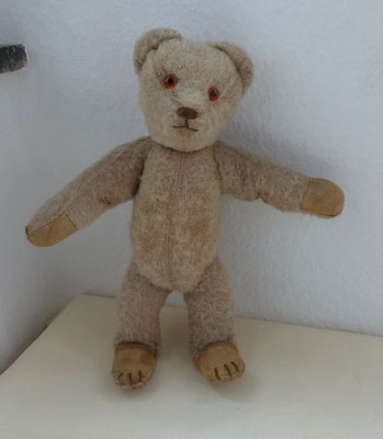 Pappeinlagen in den Füßen - kleine Schäden im Stoff und Glasaugen zwar an Drähten aber nicht original