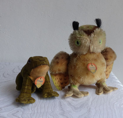 zwei alte Steiff Tiere je mit Bärenkopfschild Frosch Froggy Samt und Eule Wittie