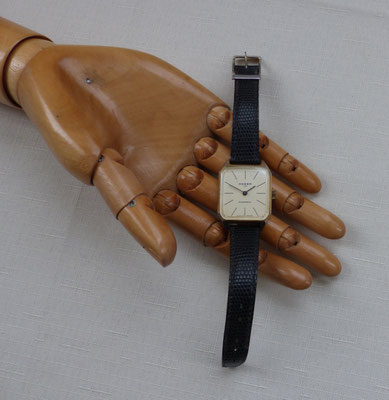die Uhr sieht ungetragen aus - durch den Versuch, den Deckel auf der Rückseite für einen Batterieaustausch zu öffnen (was mir nicht gelungen ist), ist sie dort nun etwas verkratzt ----